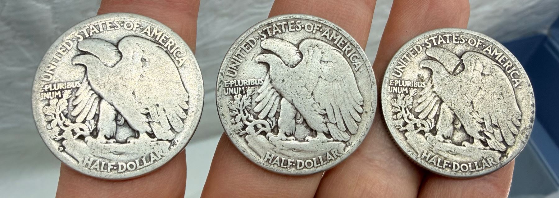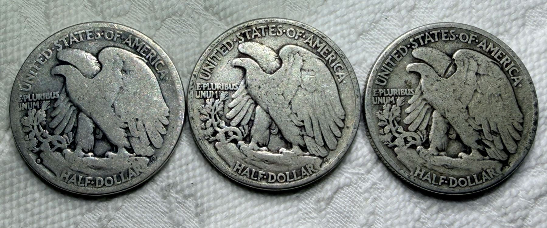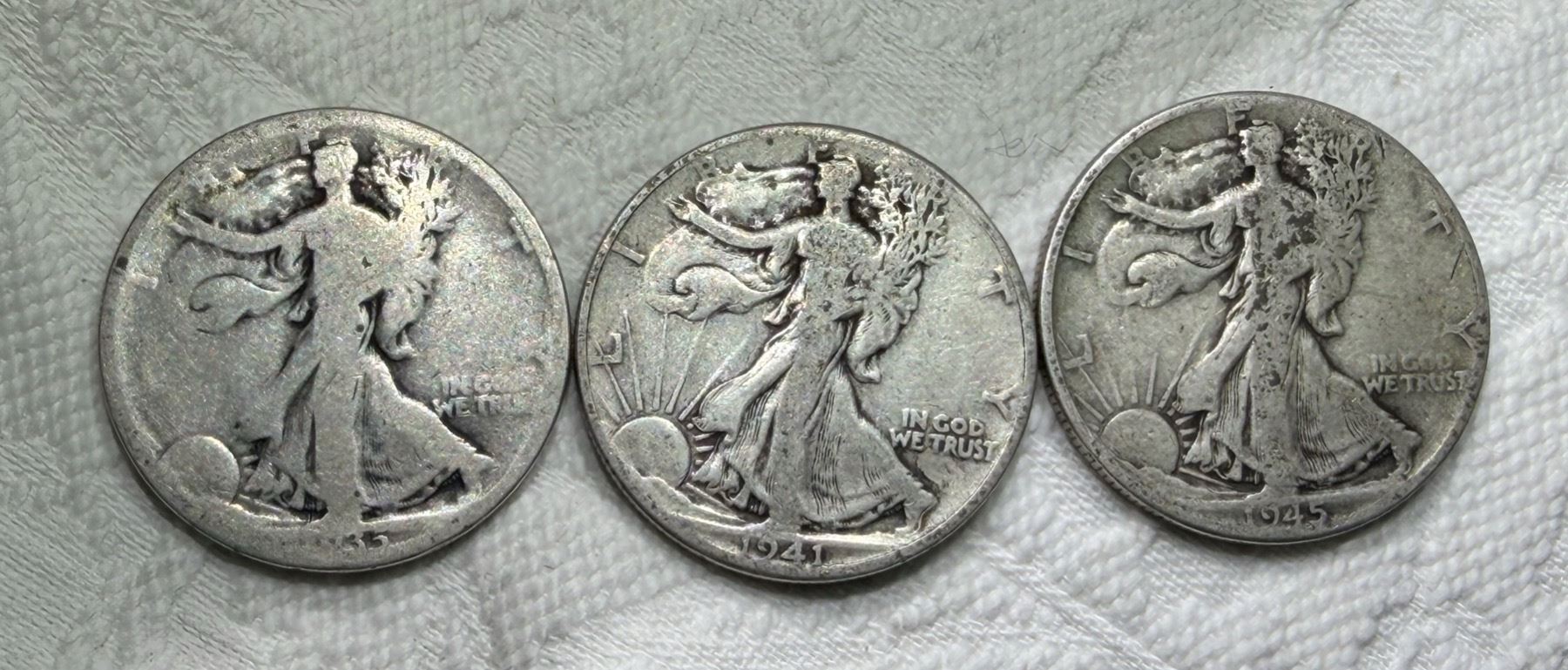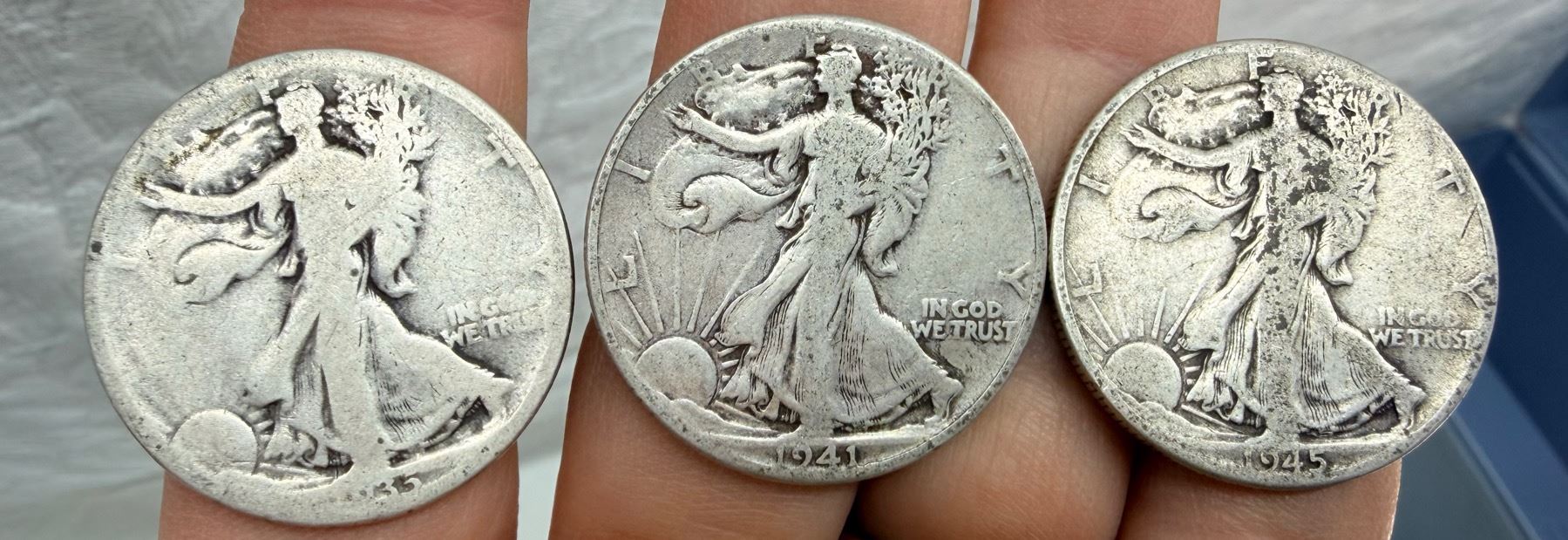 WALKING LIBERTY SILVER HALF DOLLAR - 1935D, 1941, 1945; DENVER AND PHILADELPHIA MINTS