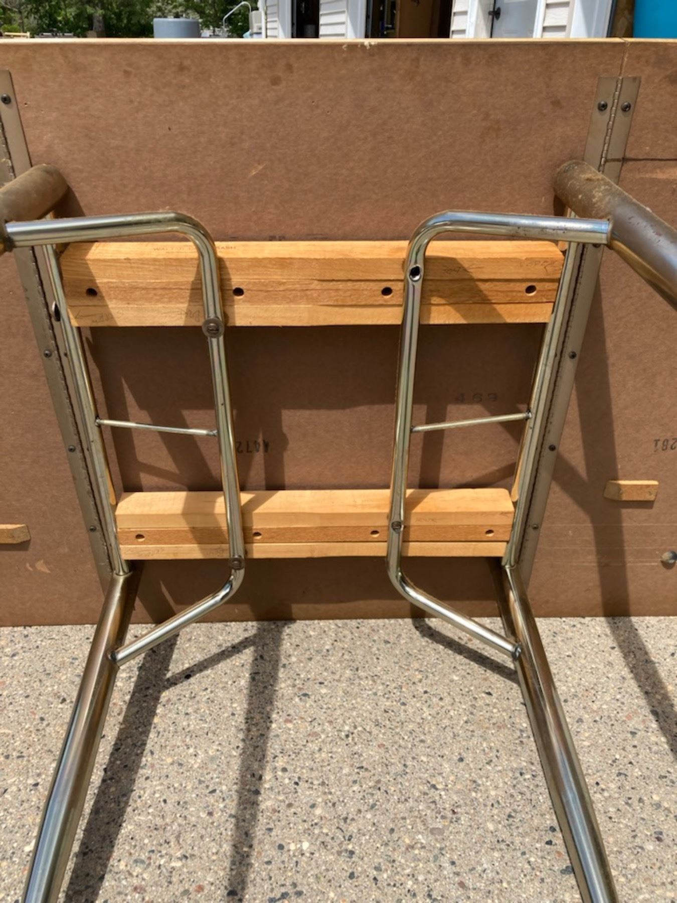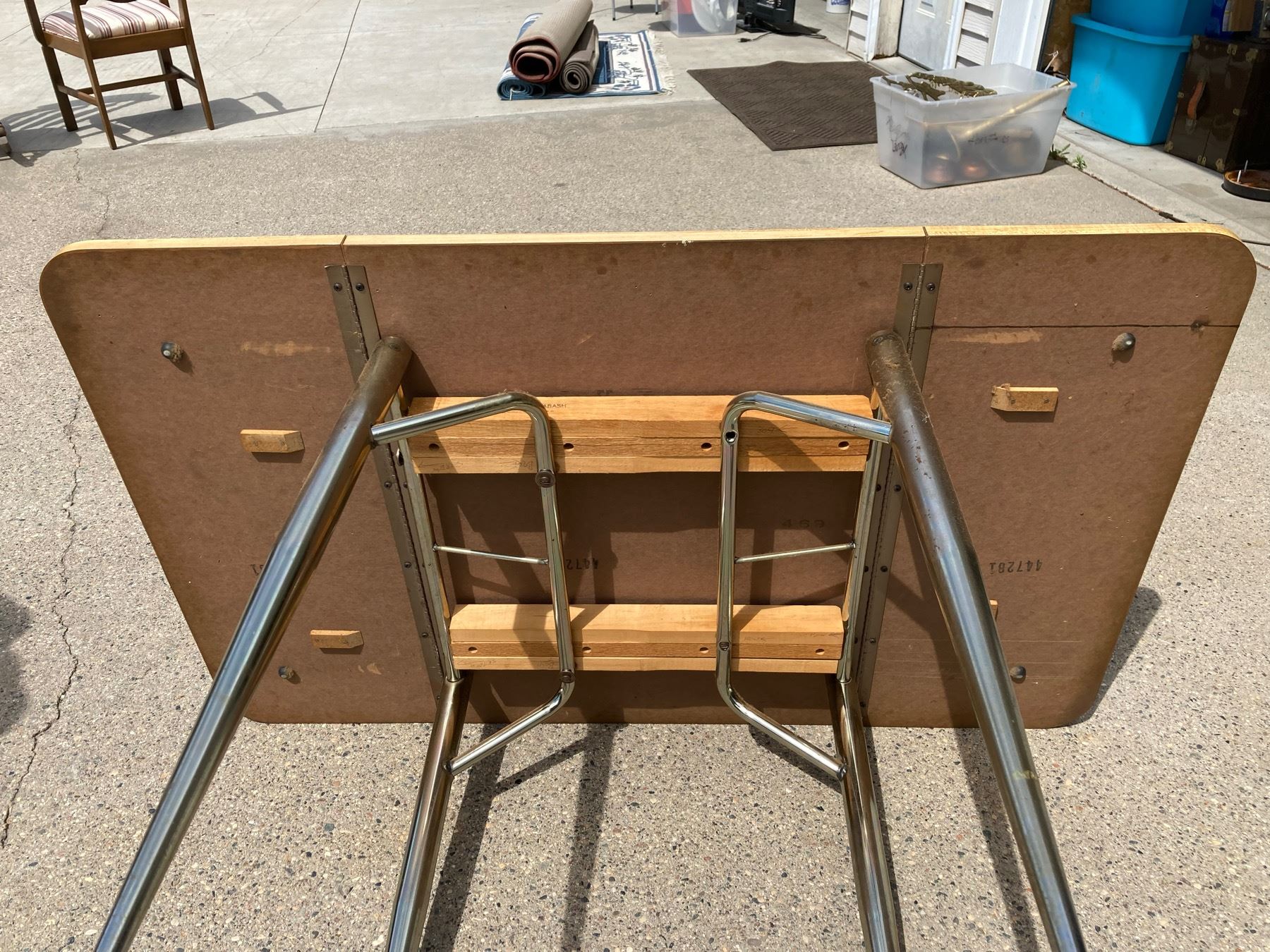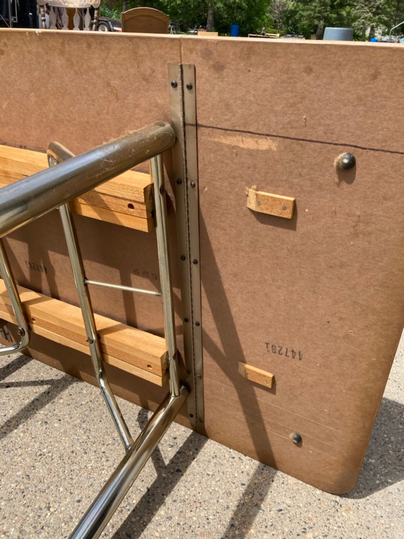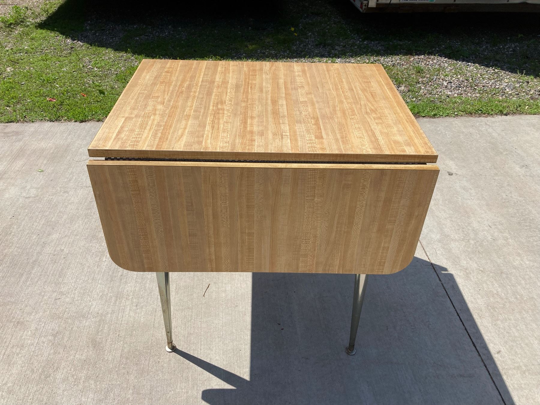 THIS IS KIND OF A COOL TABLE. LAMINATE TOP AND DROP LEAF. GOOD MANUFACTURER. NEEDS SLIDERS INSTALLED TO HOLD THE LEAVES UP.