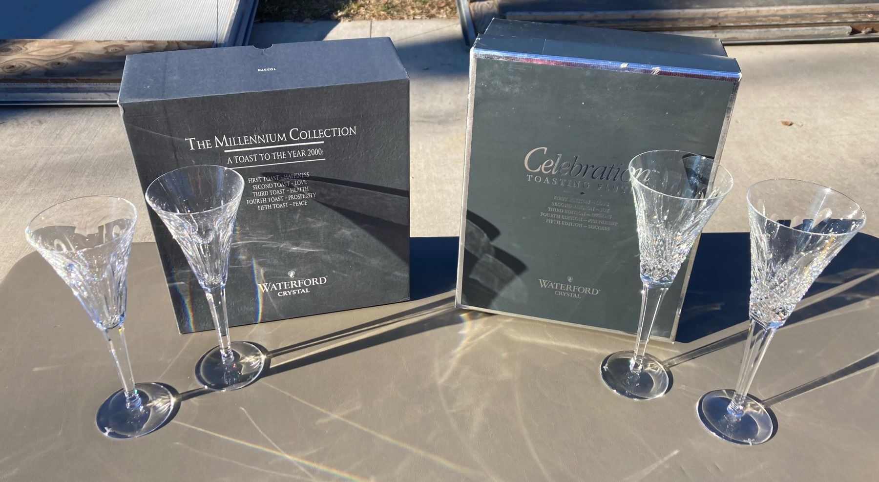 WATERFORD CRYSTAL MILLENNIUM COLLECTION TOASTING FLUTES, LOT OF 4