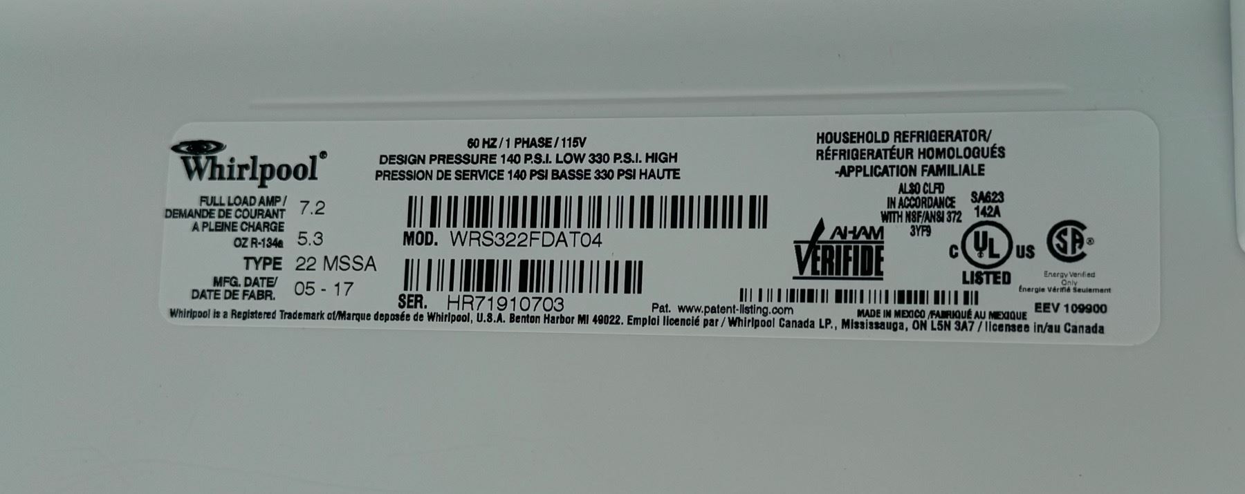 MODEL WRS322FDAT04; S/N: HR71910703; 115 V, 60 HZ, SINGLE PHASE