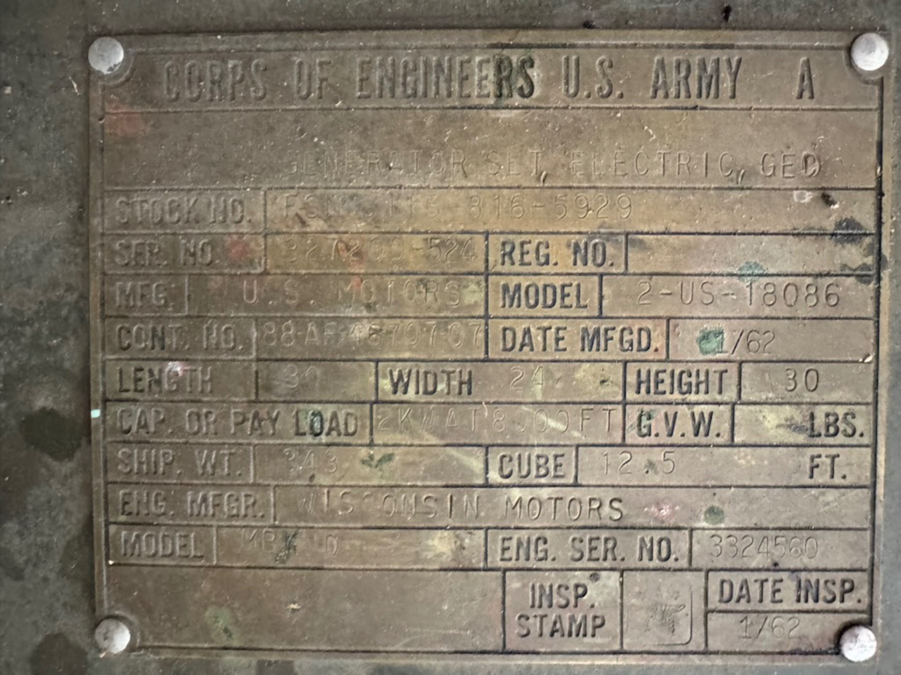CORPS OF ENGINEERS US ARMY DATA PLATE