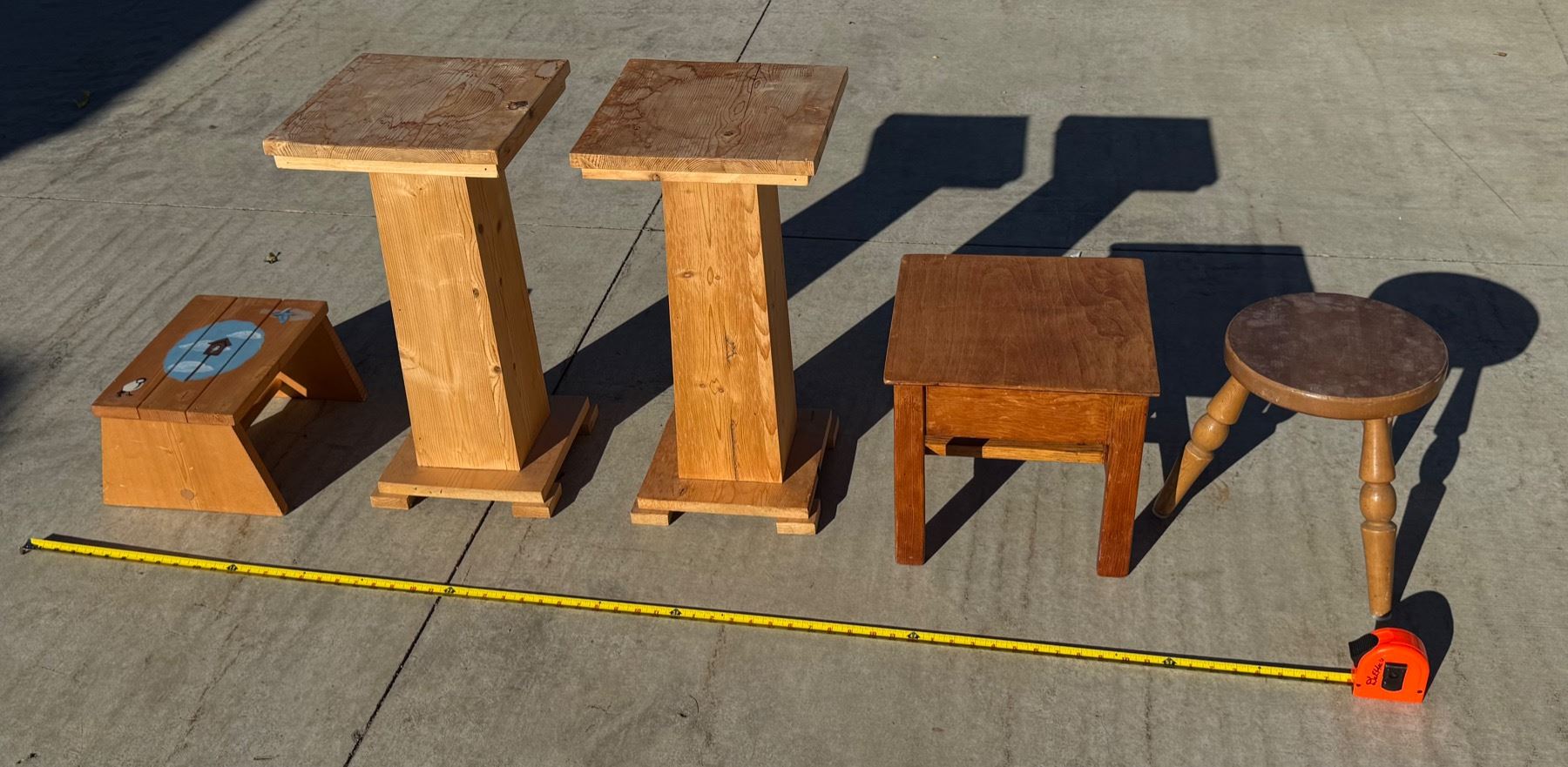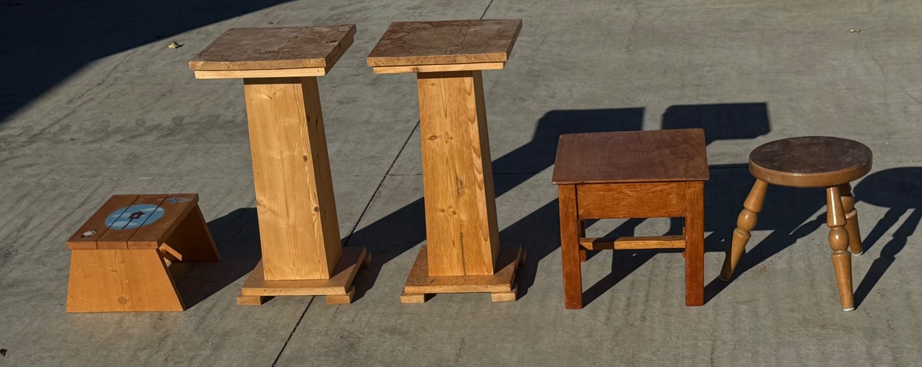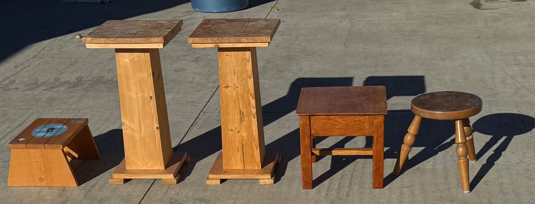 WOODEN STANDS AND STOOLS, LOT OF FIVE ITEMS