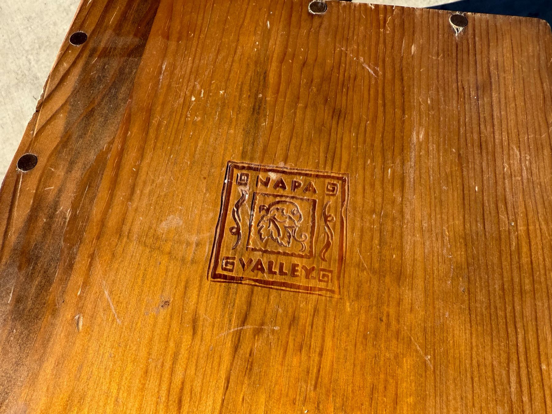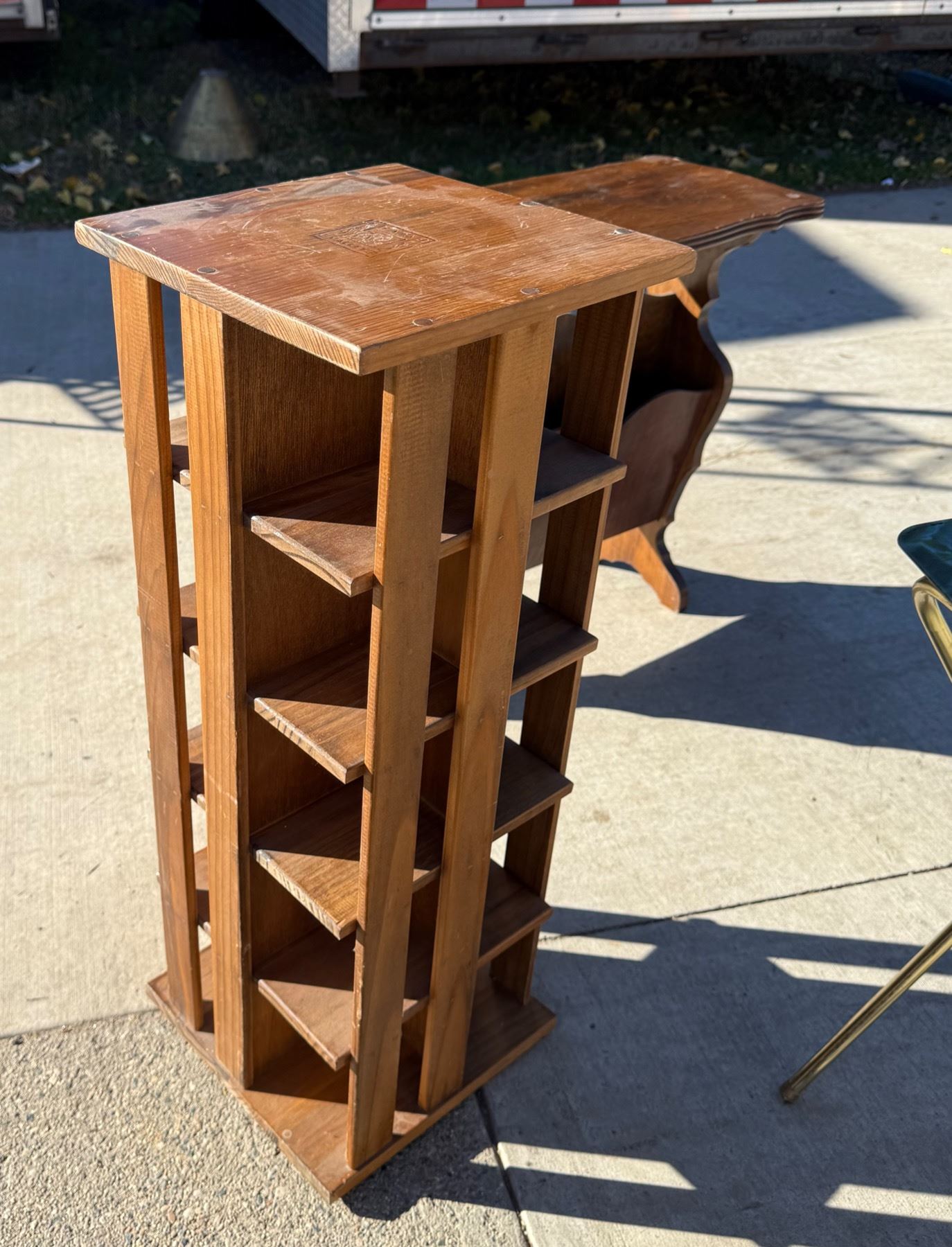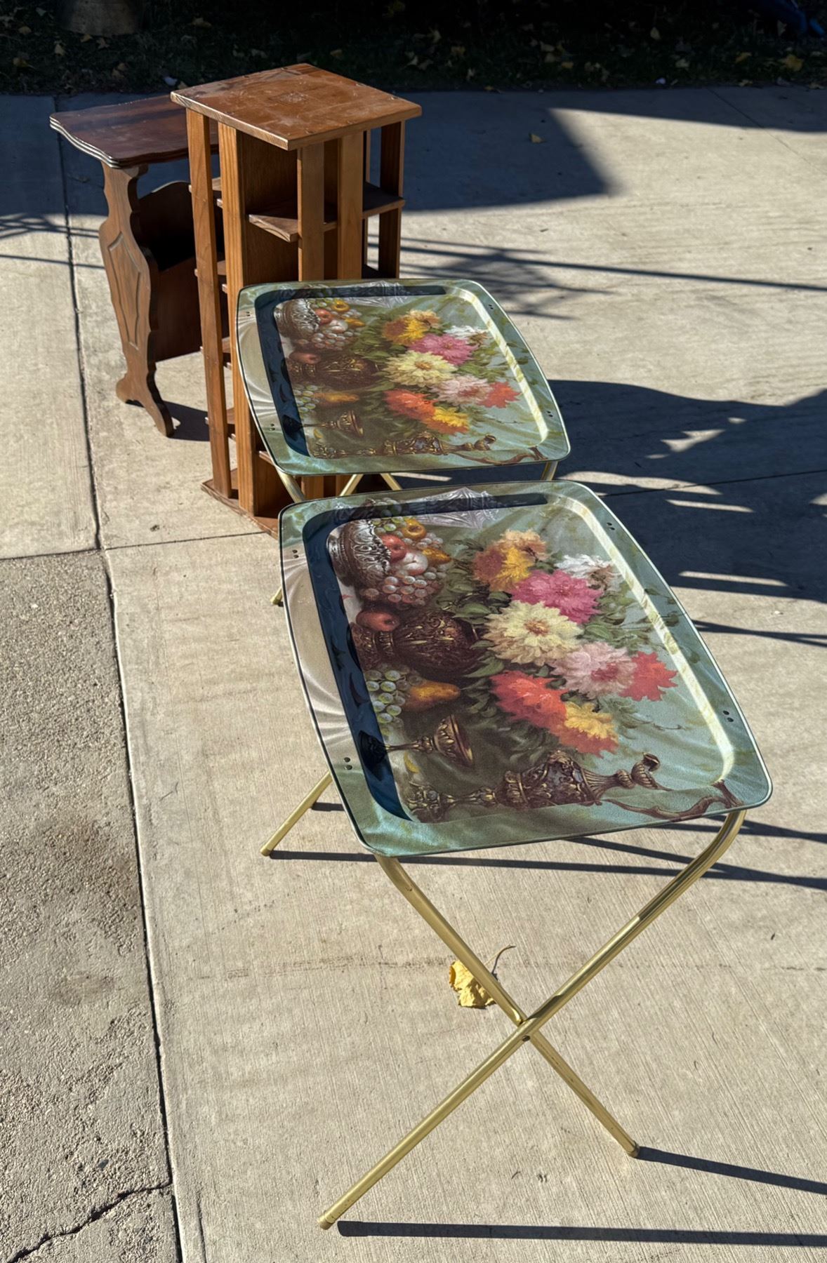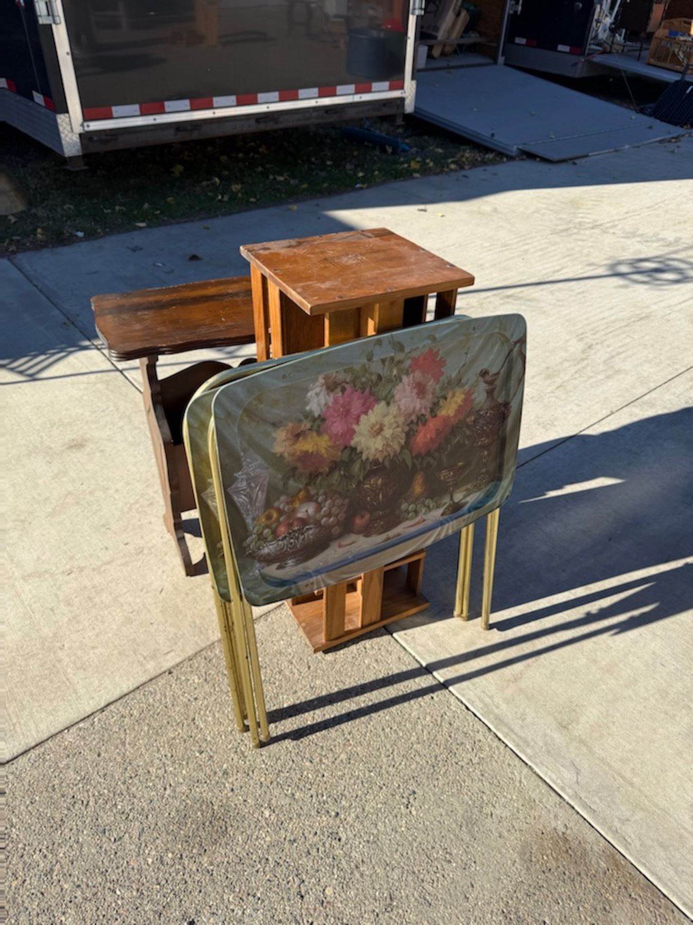 WOODEN TABLE, ROTATING RACK MADE FROM WINE SHIPPING CONTAINERS, AND METAL TV TRAYS