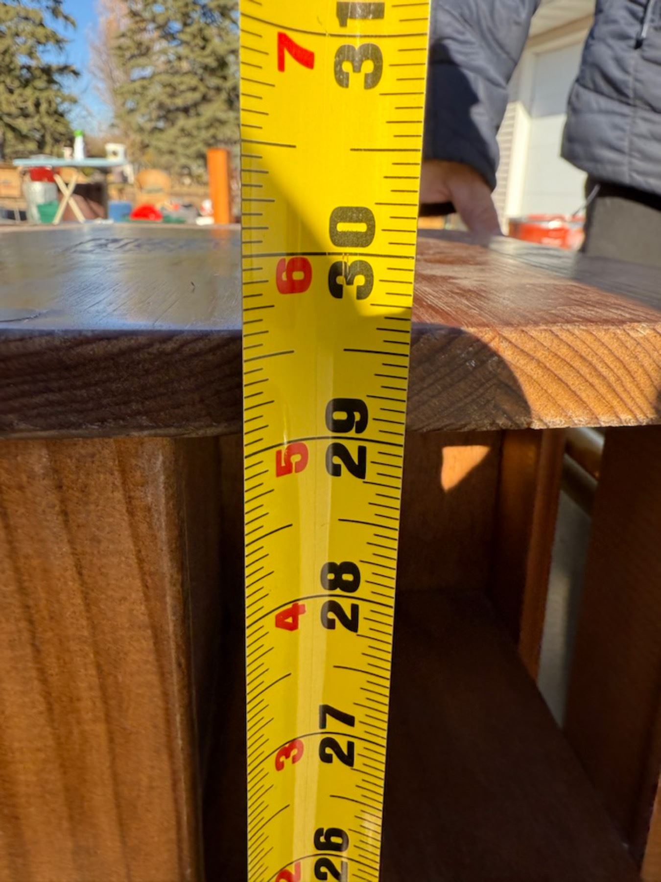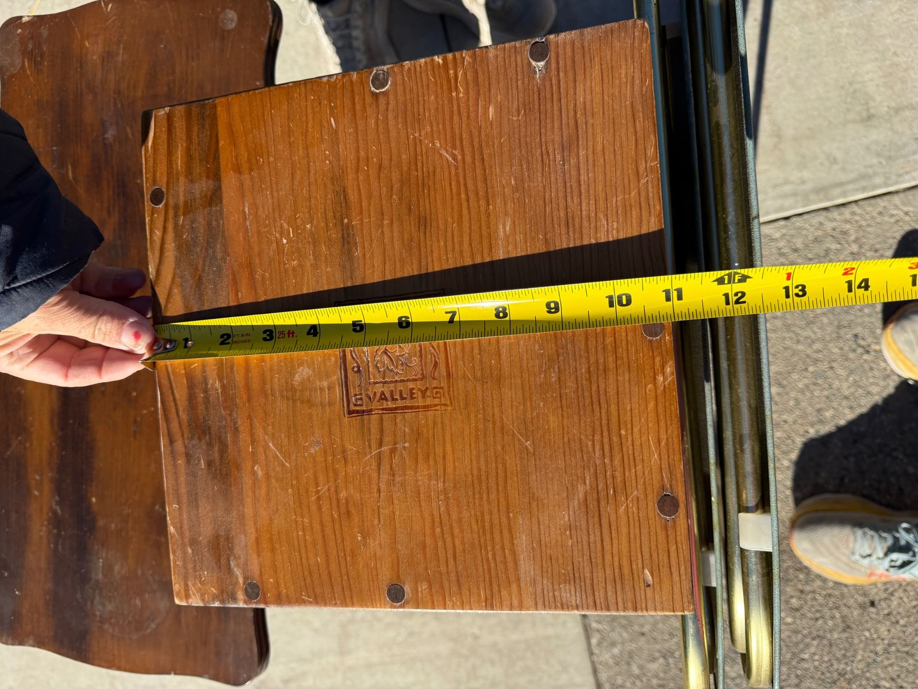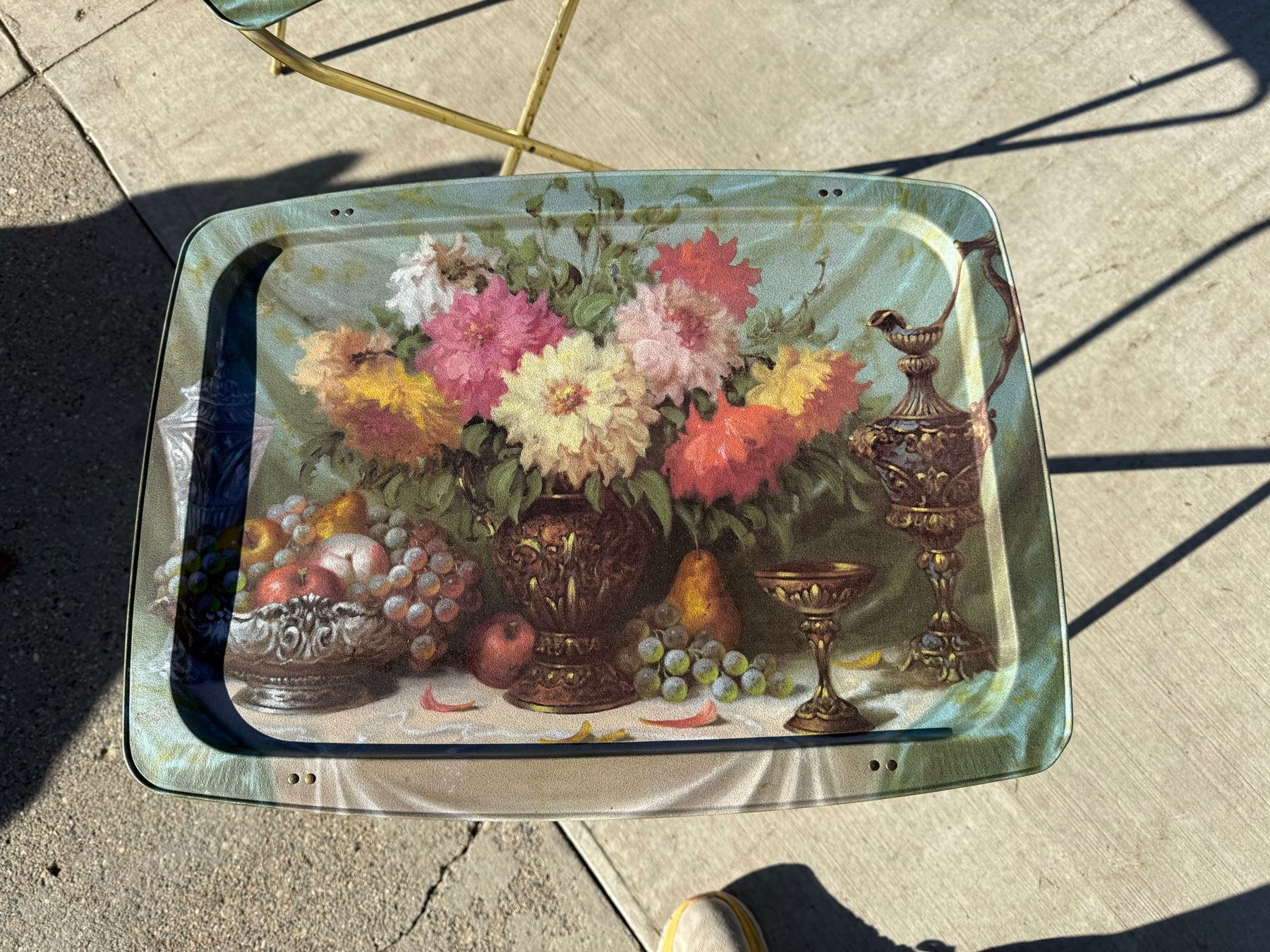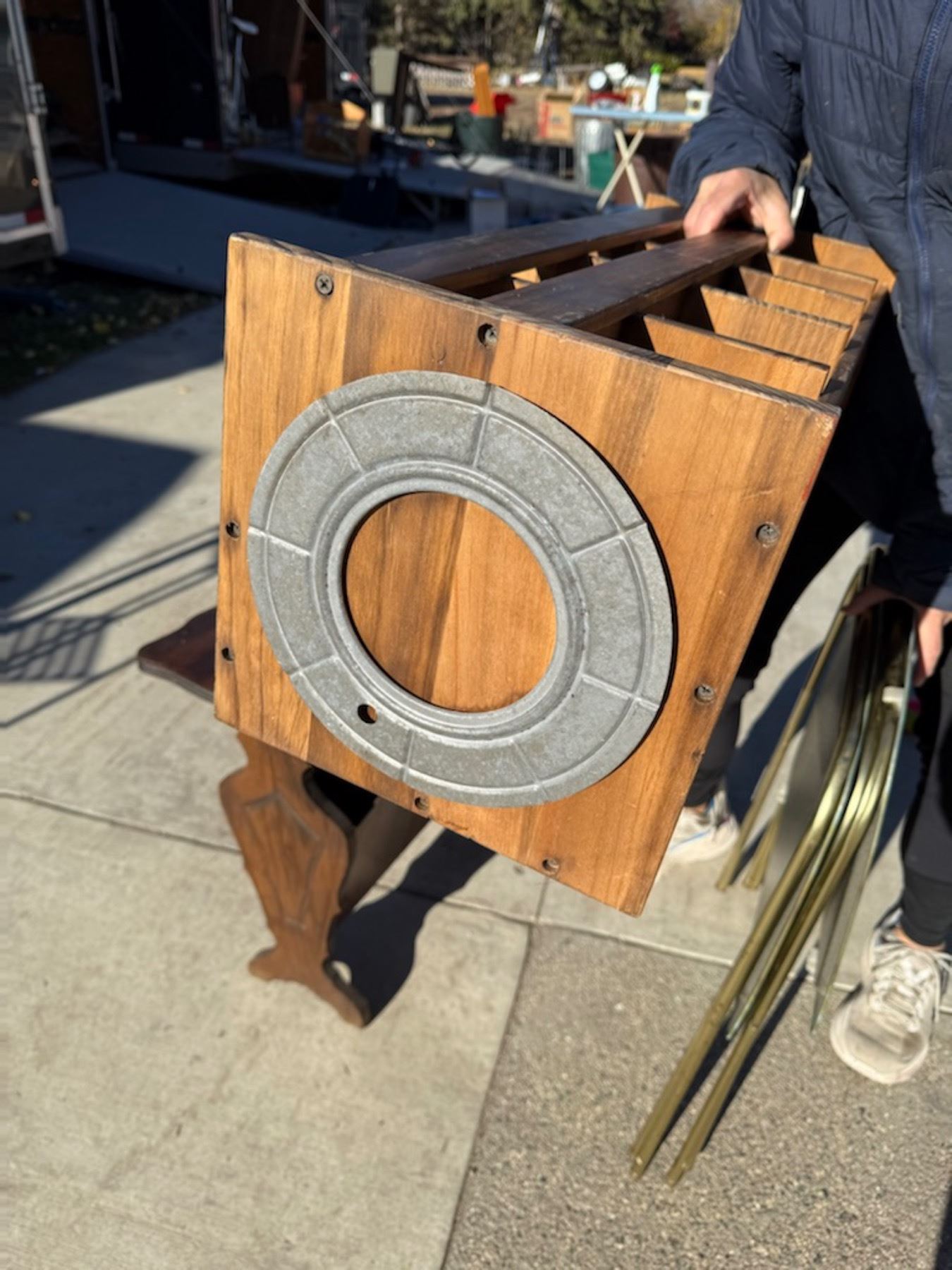 WOODEN TABLE, ROTATING RACK MADE FROM WINE SHIPPING CONTAINERS, AND METAL TV TRAYS